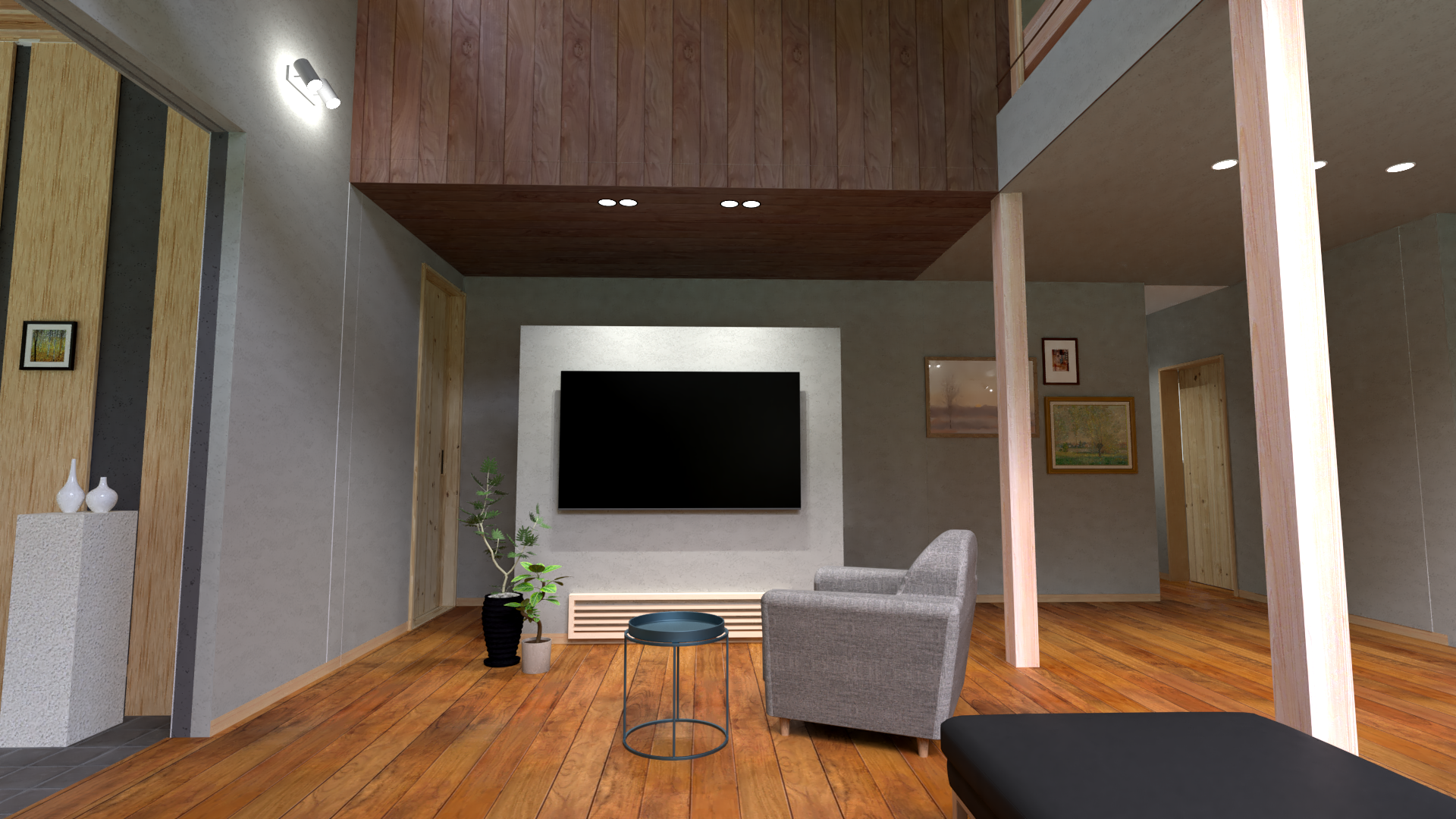 信州木材/床:天然無垢材(山桜)/壁・天井:珪藻土、一部板張り/