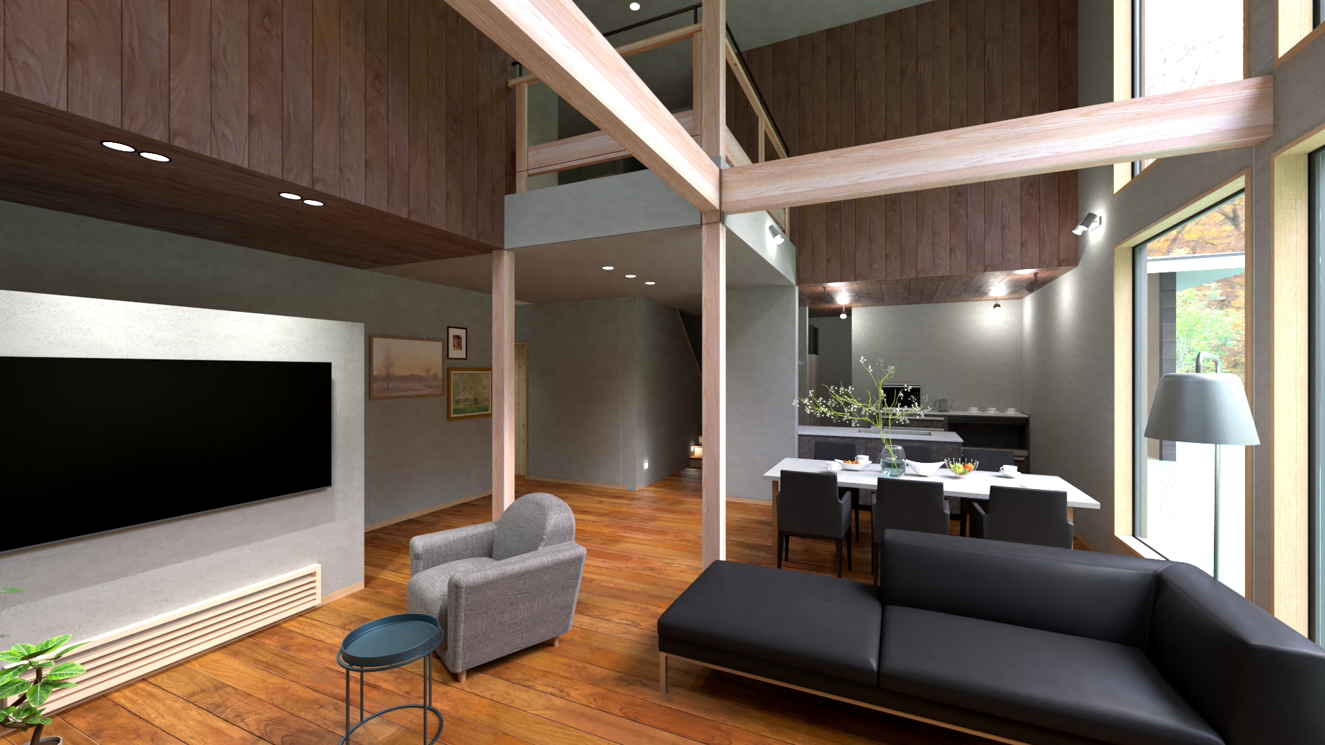 軽井沢の移りゆく美しい四季を映し込んだ「光と風」が巡る邸宅をつくりました。隔たりのないLDKには約24帖の吹き抜け。南側に大きな窓から陽の光が降り注ぎ、部屋全体を包み込む空間設計にしました。陽の光が時間ごとに異なる陰影を作り出し、リビング空間に豊かな彩りをもたらします。