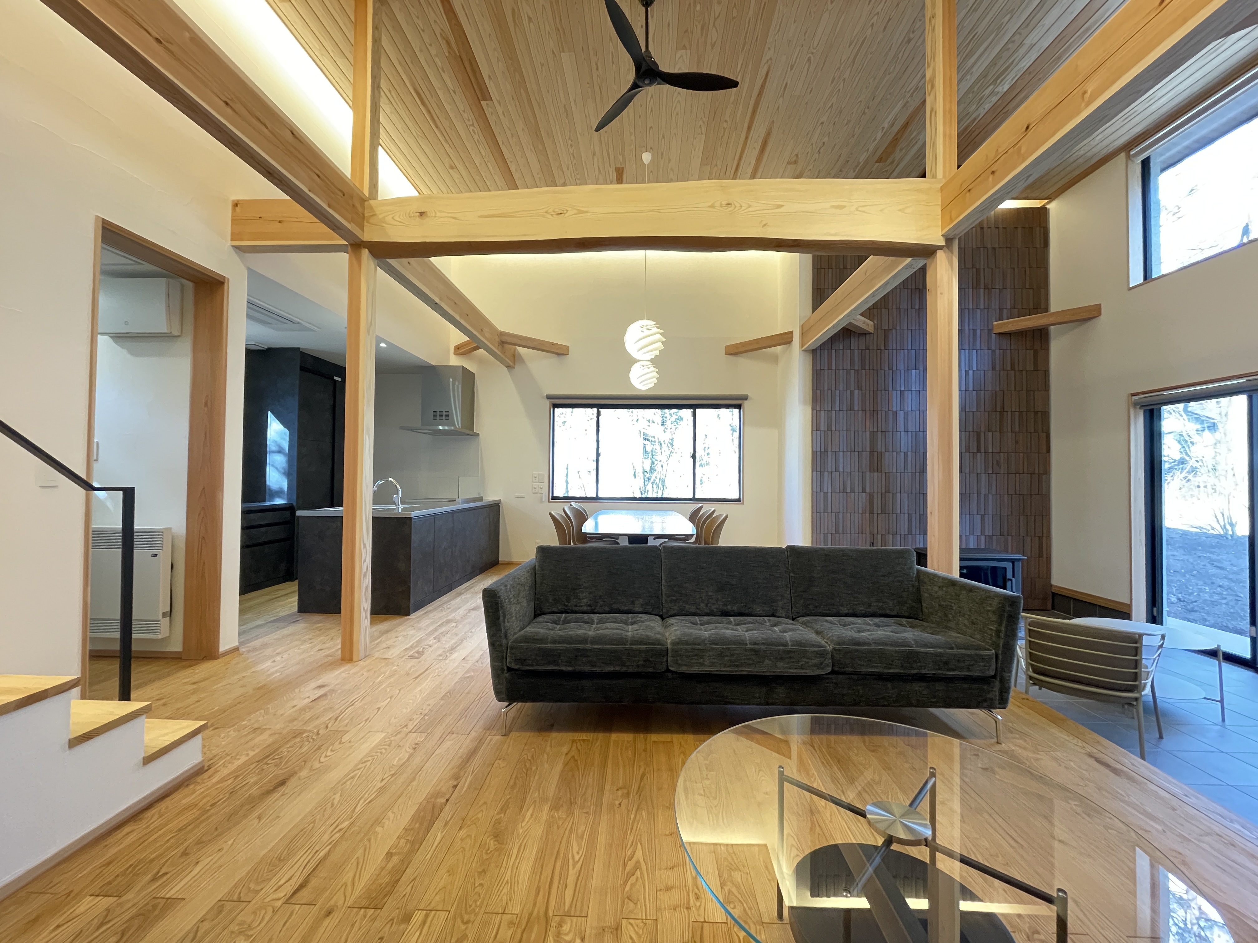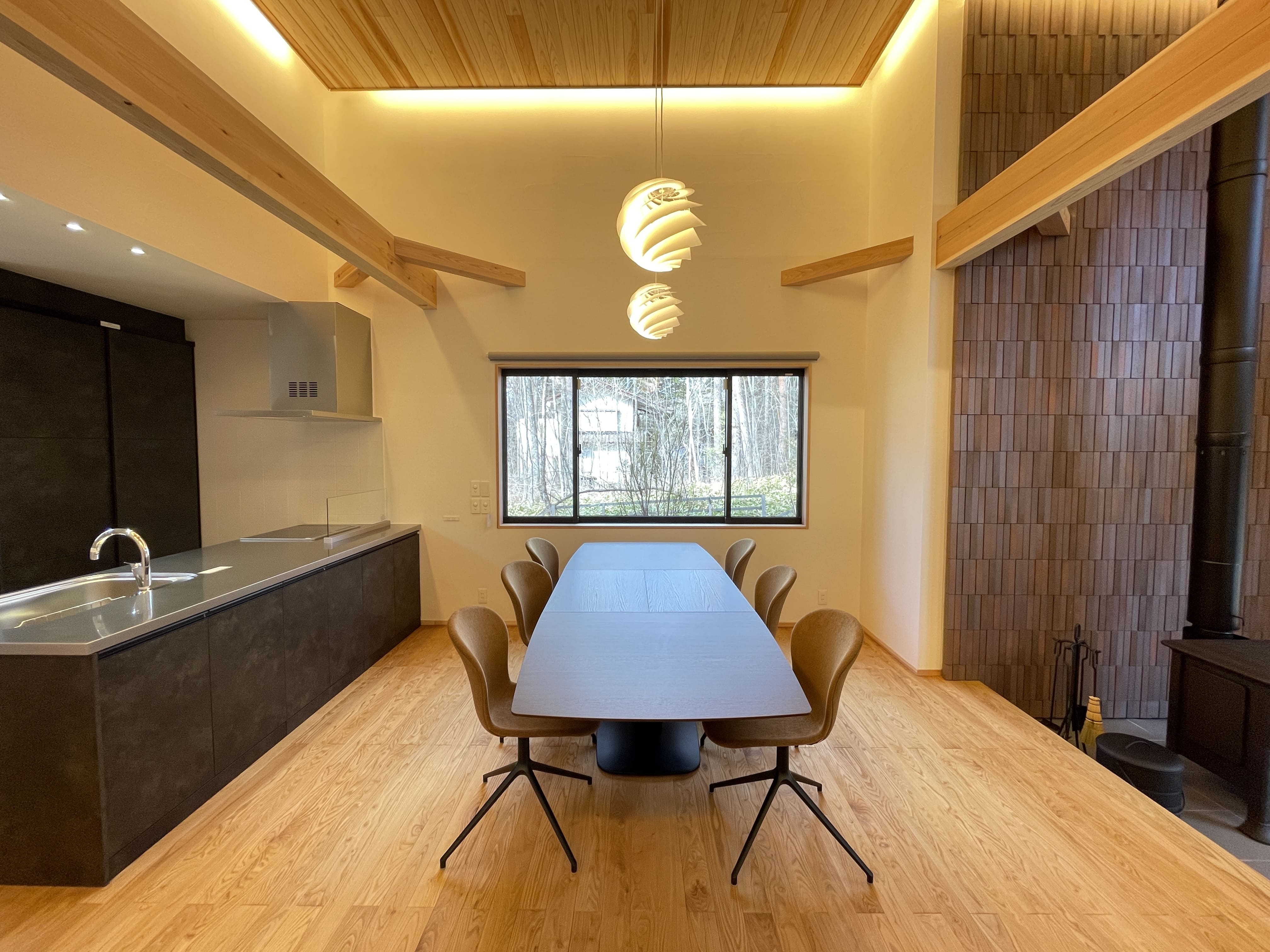 大きな窓がまるで一枚の絵画のように、外の景色を日常に切り取るダイニング。内観は無垢材の床、珪藻土仕上げの壁、すべて自然素材を使用したぬくもりのある柔らかさを感じて頂けます。天井の杉板張りを照らす間接照明が、心地よい雰囲気と自然の美しさをさらに引き立てています。