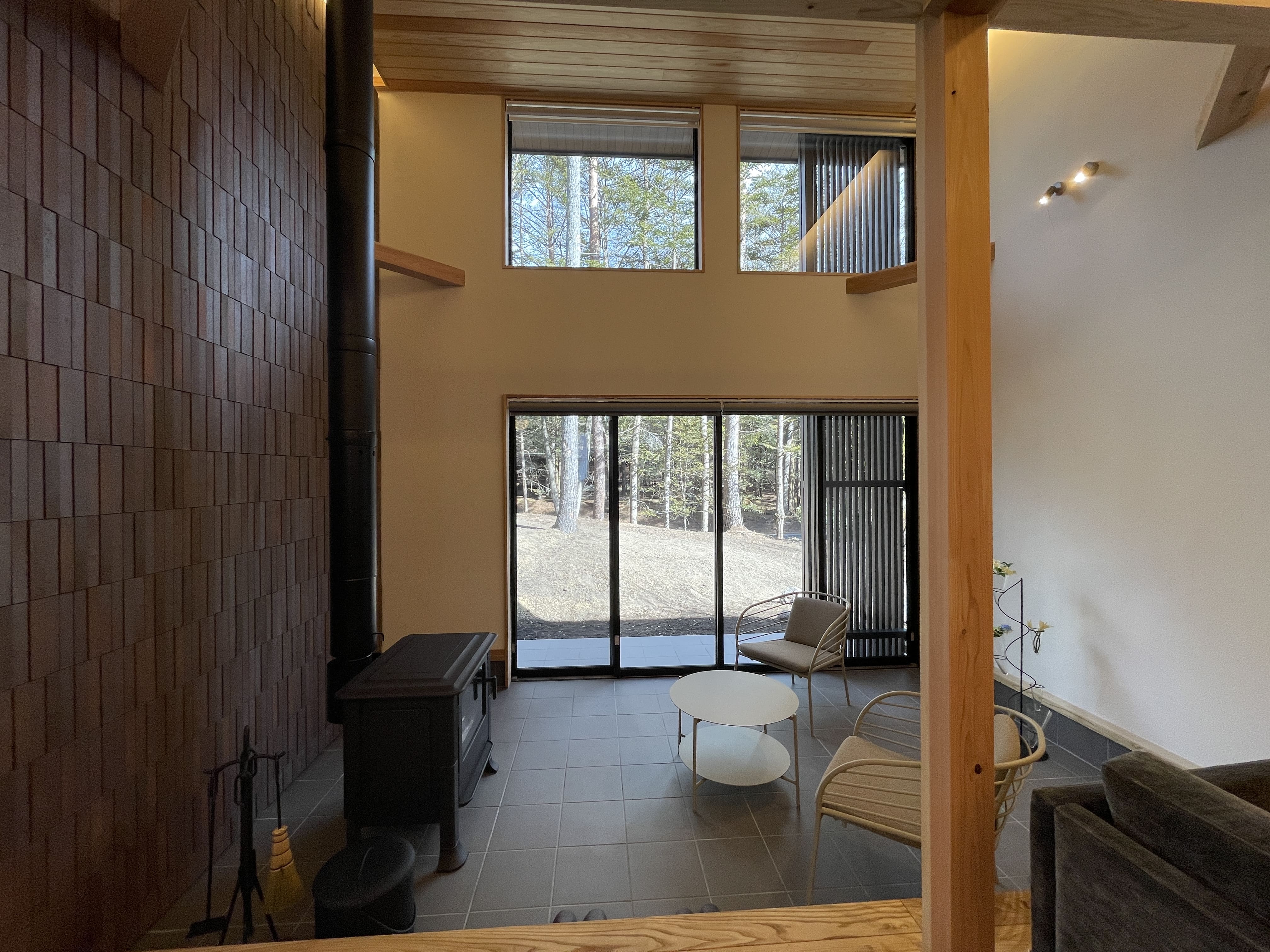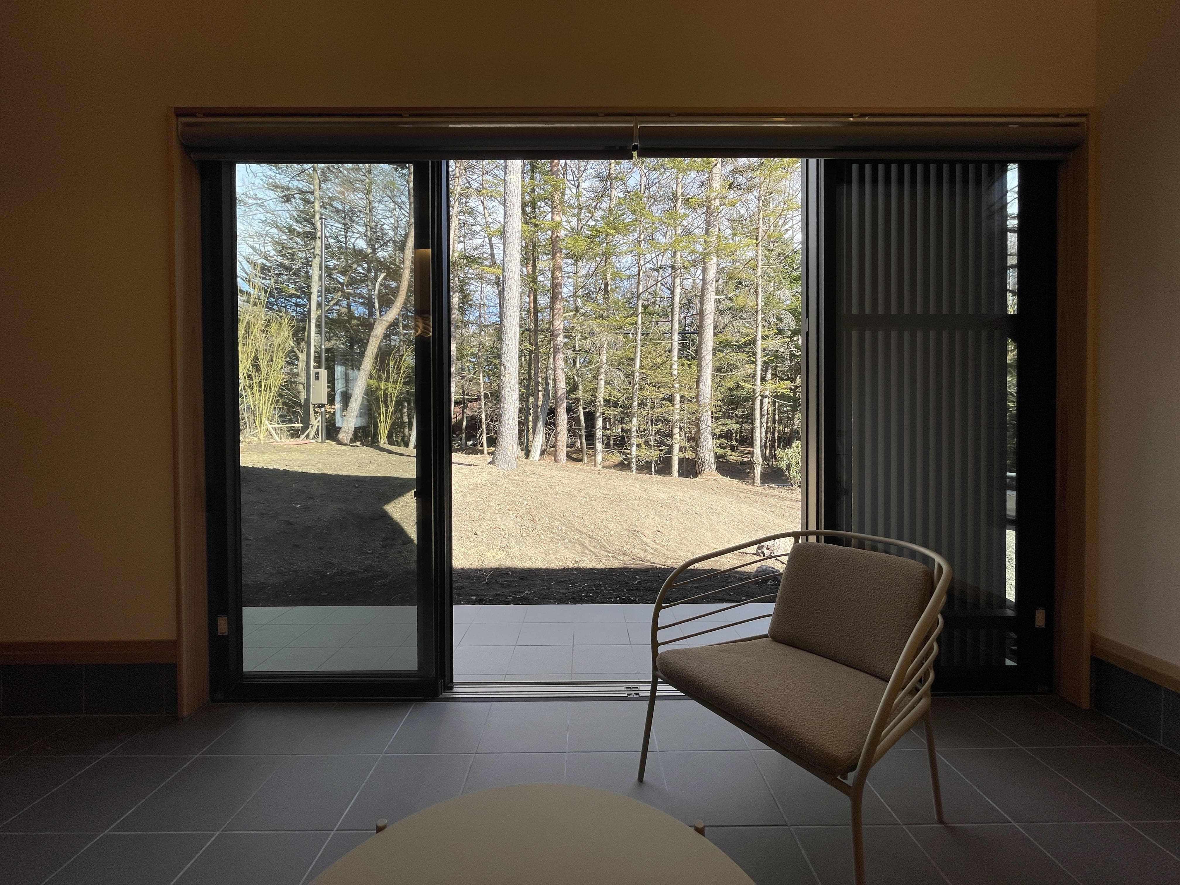 土間サロンは、重厚なタイル張りを施したスタイリッシュな空間。軽井沢の四季を感じるとっておきのスペースです。