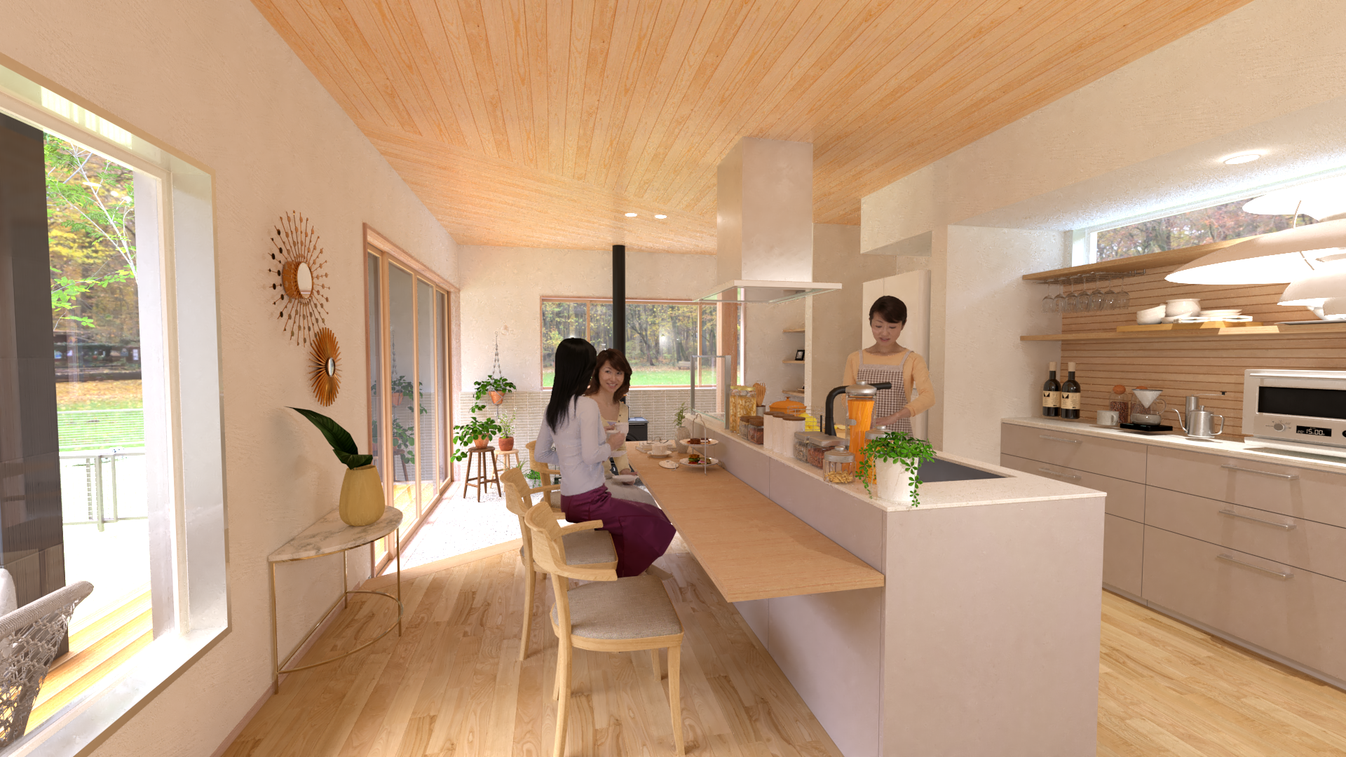 各居室を南側に配置し、室内が陽だまりに包まれるように空間を設計。土間サロンから続くデッキテラスは、まるでセカンドリビングのように過ごせる場所に。アウトドアキッチンも計画し、BBQや焚き火が気軽に楽しめます。昼下がりの読書や空を仰ぎながらリラックスするひとときが、アウトドアキッチンと連動することで、外の暮らしが日常の一部となります。