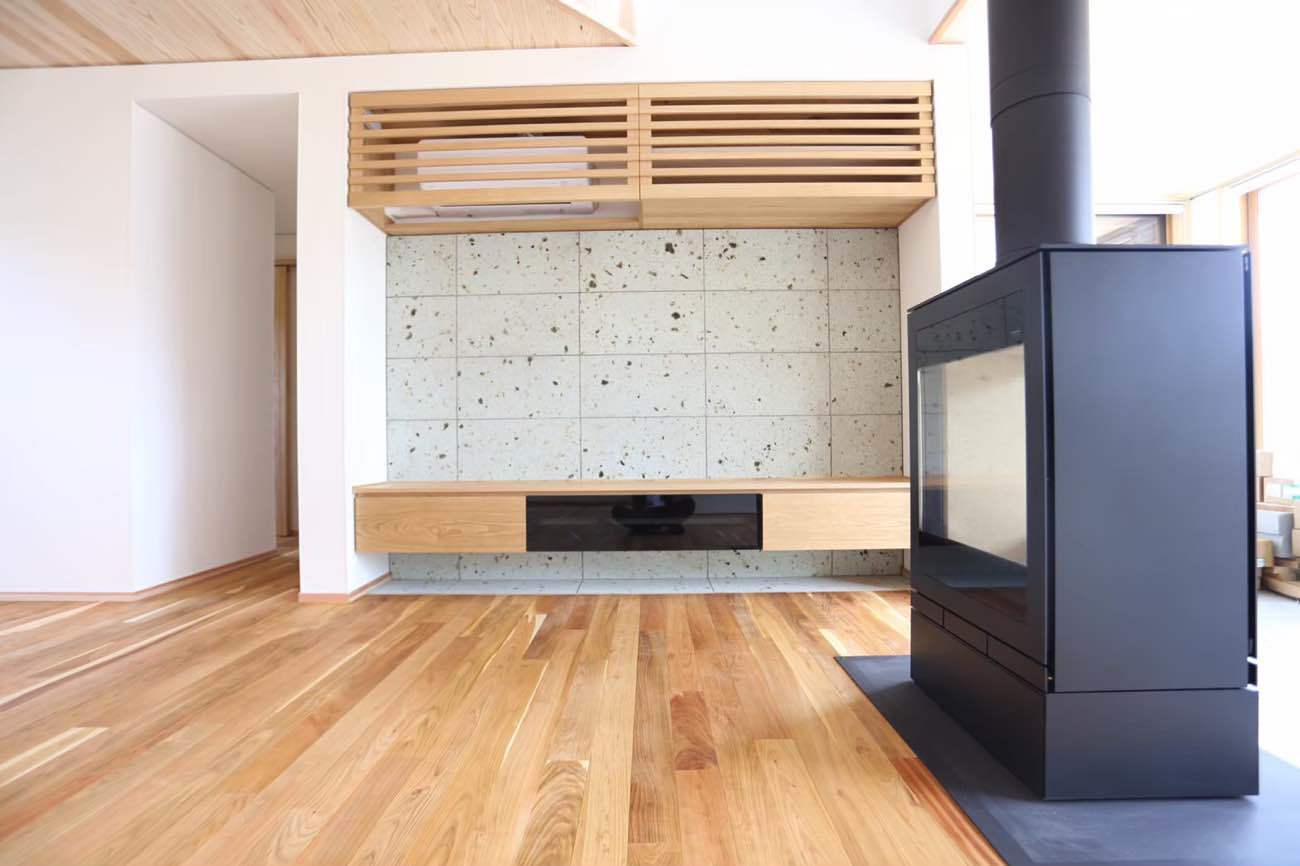 ゆとりある別荘建築では、両面ガラスの薪ストーブも人気。大胆に建物の中心に薪ストーブを据えて、家じゅうどこからでも炎を眺められるようにすれば、暖房効率もバッチリです。