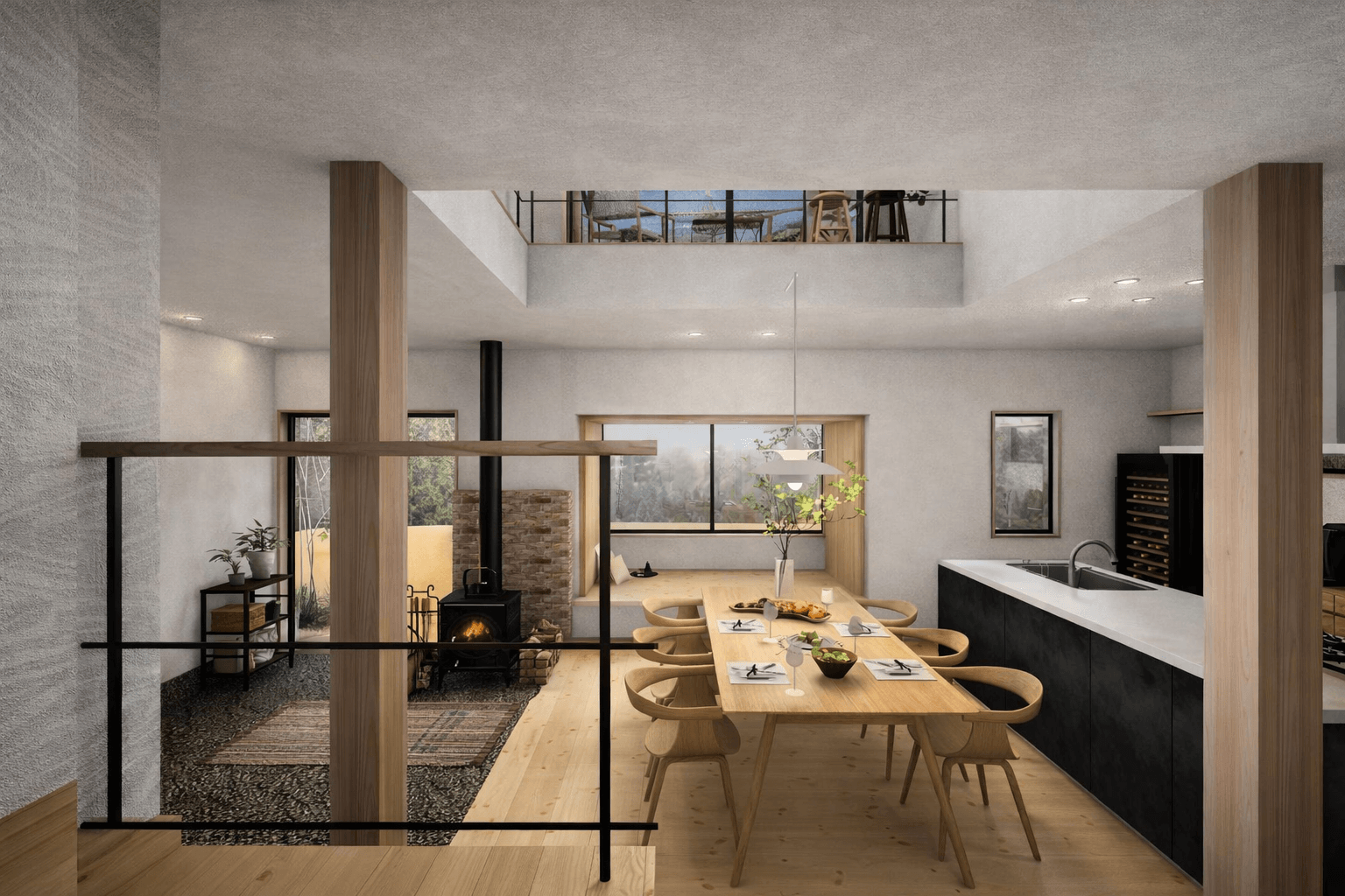 上部には吹き抜けを設け、光と空気がやさしく行き交う開放的な設えに。縦の広がりが空間にゆとりを生み、どこにいても家族の気配を感じられる一体感が生まれます。