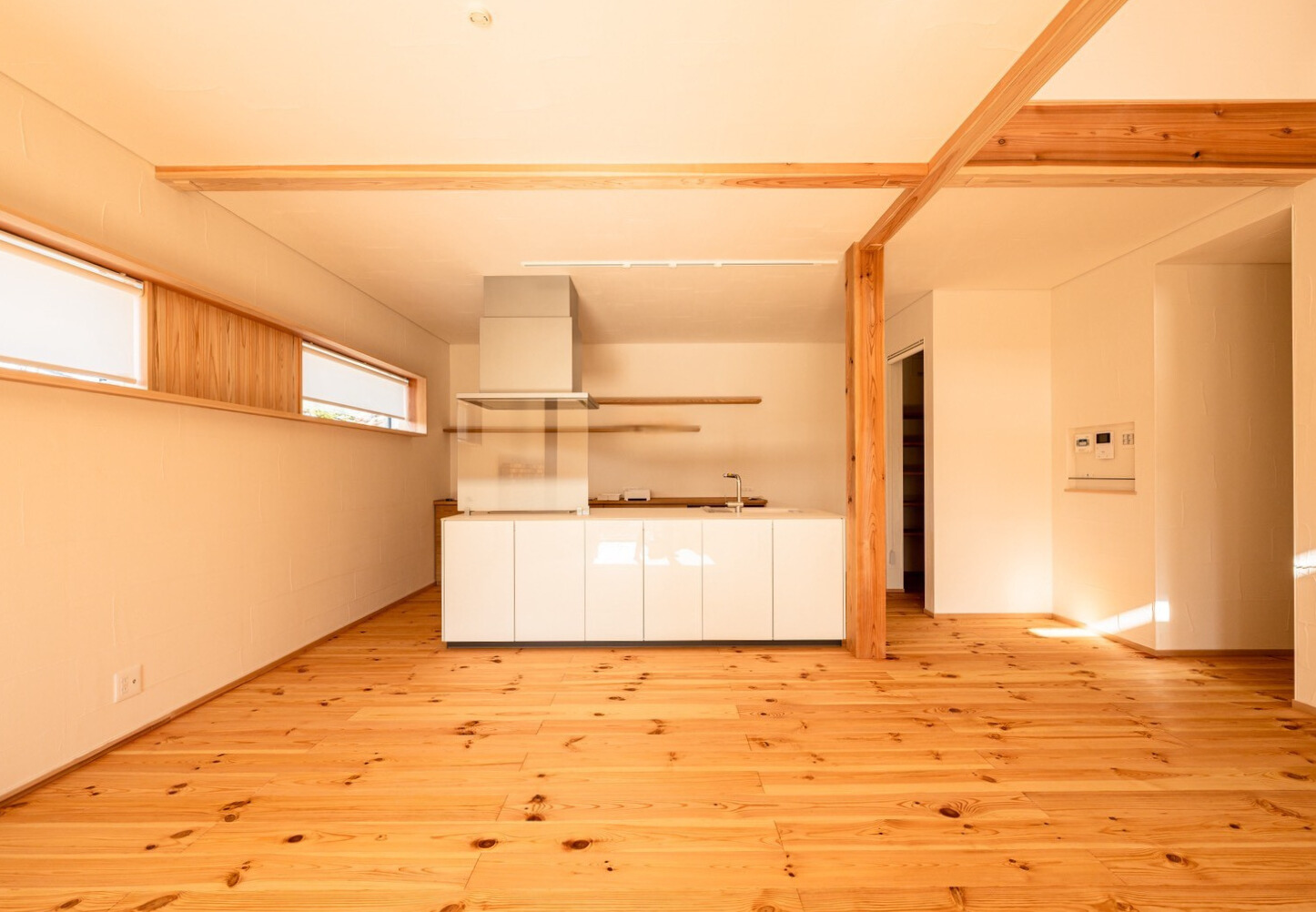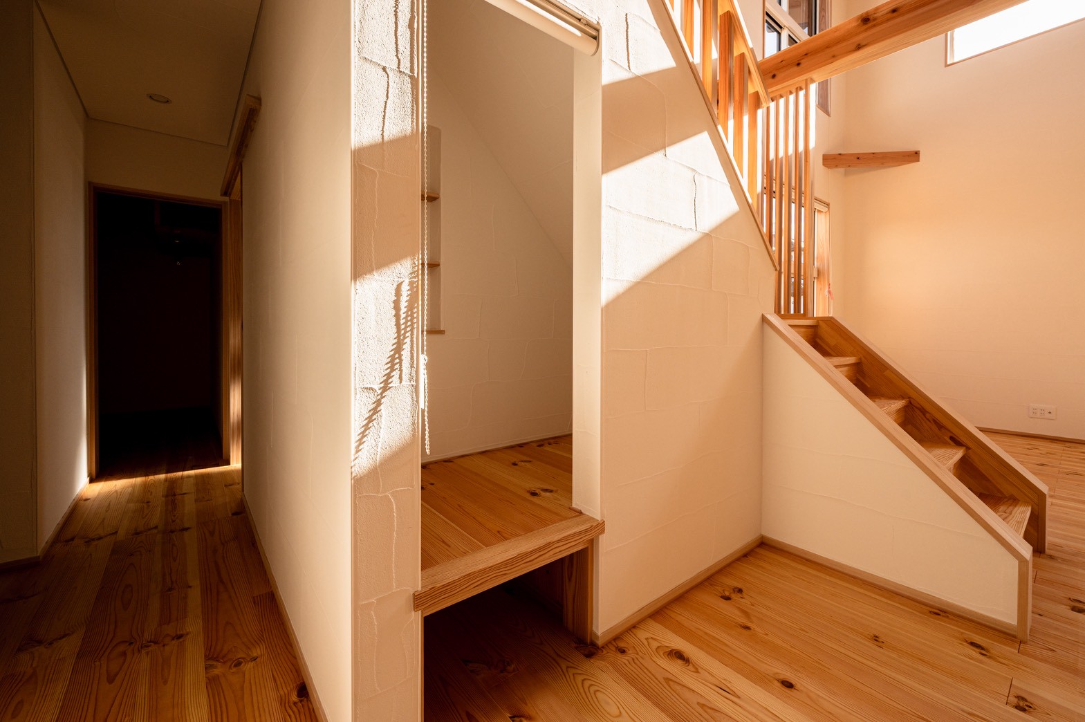 吹き抜けによる縦の広がりと、現しの梁、無垢の木、白い珪藻土の壁が心地よく調和し、家に入った瞬間から特別な開放感に包まれます。
