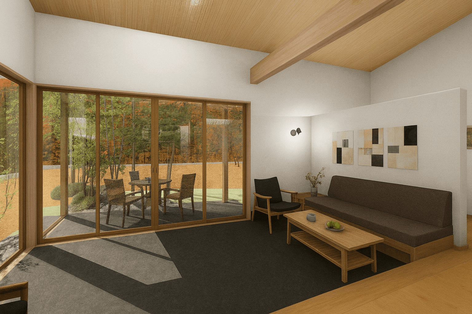 土間サロンやご夫婦それぞれの書斎からは、八ヶ岳の森を望むことができます。四季を感じながら、自然と寄り添う暮らしです。