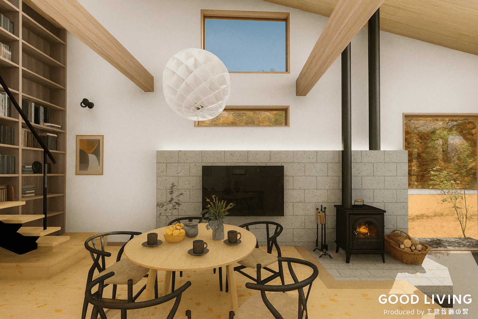 また、炉壁をテレビボードまで伸ばしたデザインで、空間全体に統一感とスタイリッシュさを演出しています。