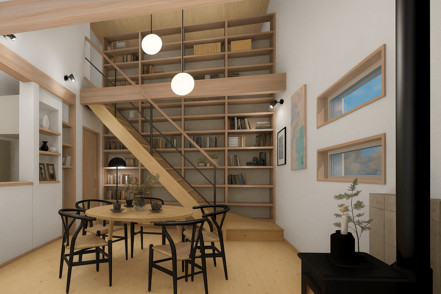 360°の森を楽しむ、階段本棚と土間リビングのある家