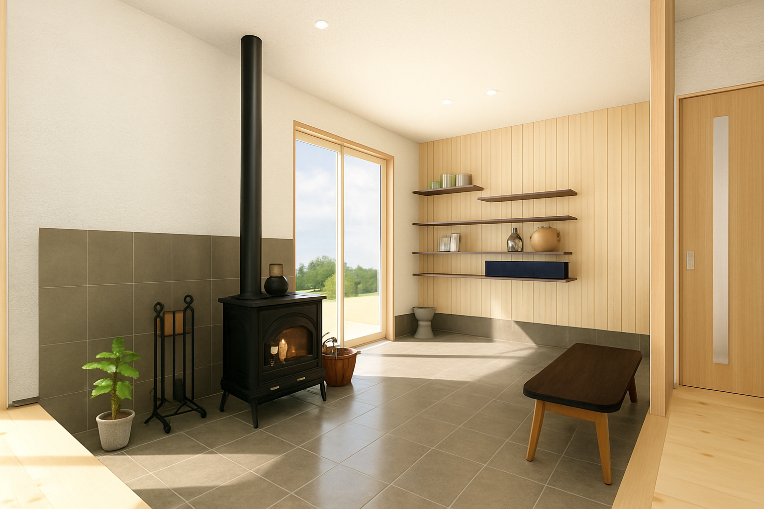 土間サロンには薪ストーブとソファを置き、火を見ながらくつろげるもう一つのリビングとしました。