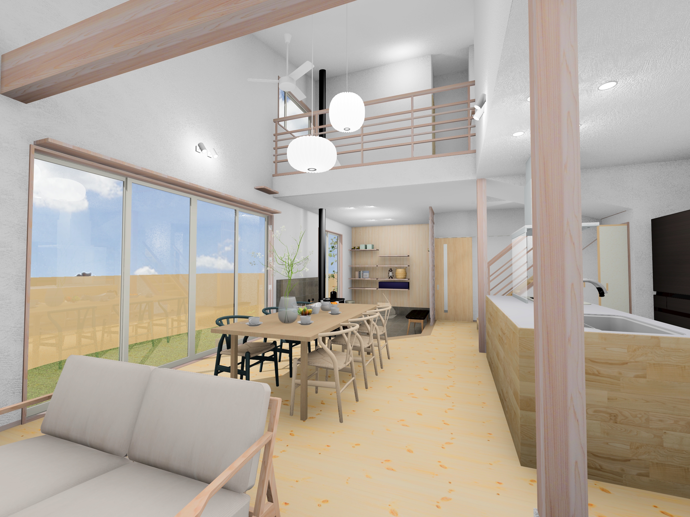 キャンプギアを眺める土間サロンと、木製造作キッチンの家