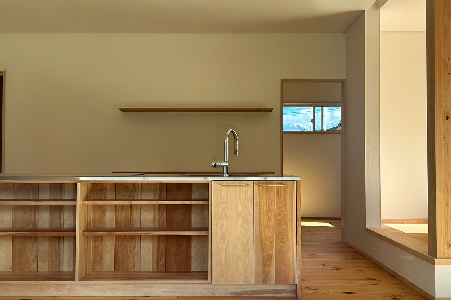 こだわりの木製オーダーキッチンは、松本市の家具工房、アトリエm4制作のもの。