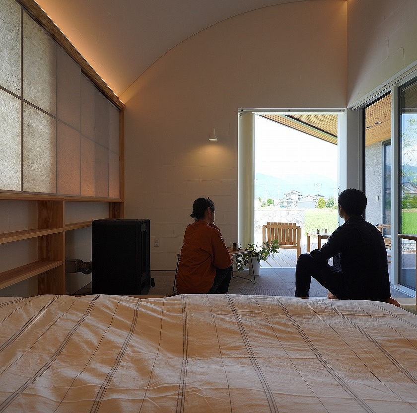 家族の空間と分けることで、泊まりのゲストも夜中や早朝に気兼ねなく過ごせる「離れ」のような独立性を持たせました。
