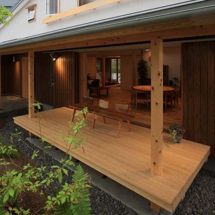 オーナー様が手をかけて育ててきたお庭を存分に感じられるよう、ダイニング横の大きな掃き出し窓からフラットにつながるウッドデッキを設けました。