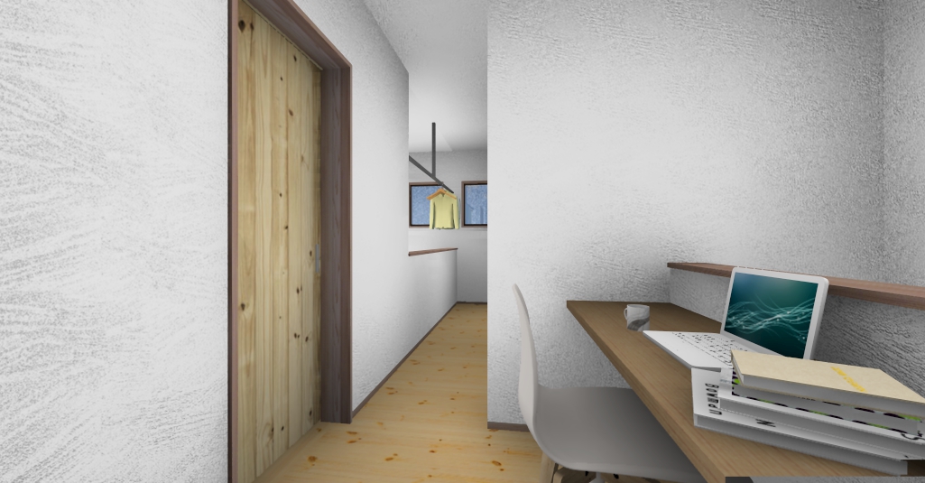 階段を上がった先には、ご夫婦やお子様が並んで使える幅1.6mの造作ワークスペースを設けました。