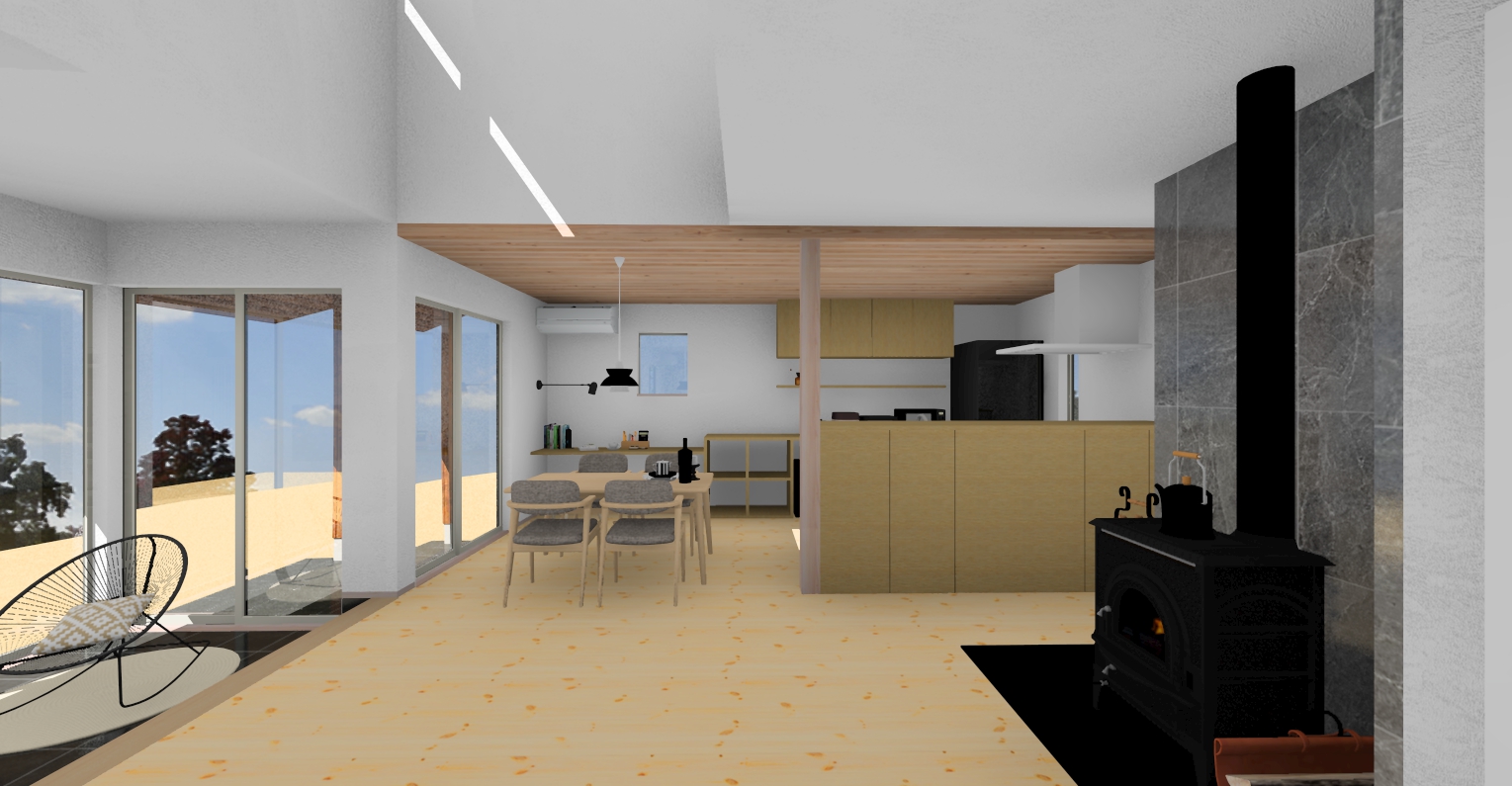 夏は外の風を感じながら涼み、冬は薪ストーブの炎を眺めて過ごす、四季を通して心地よい空間です。