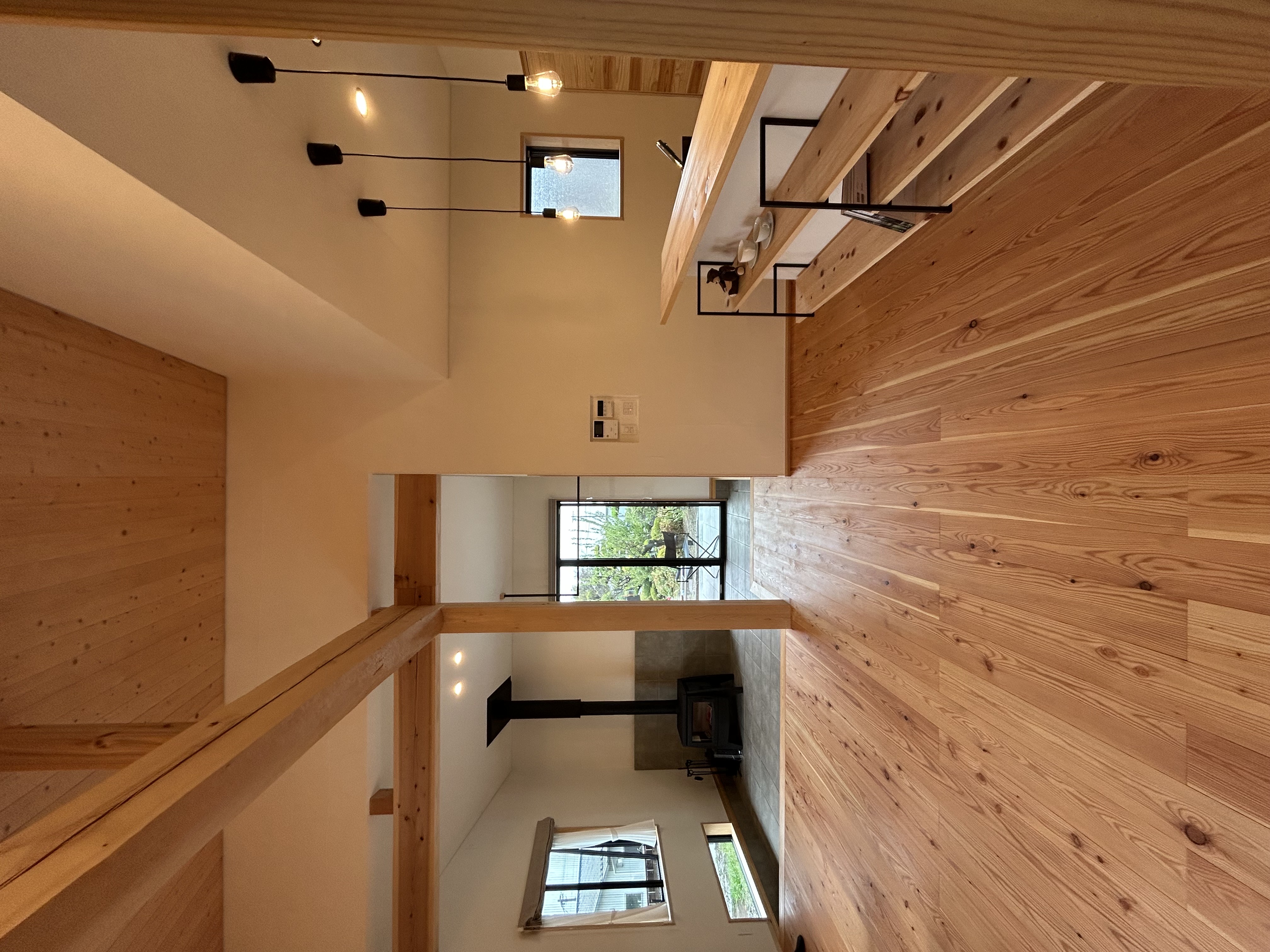 無垢材と珪藻土の白を基調に、板張り天井や薪ストーブの黒が映える、素材感豊かなリビング空間です。