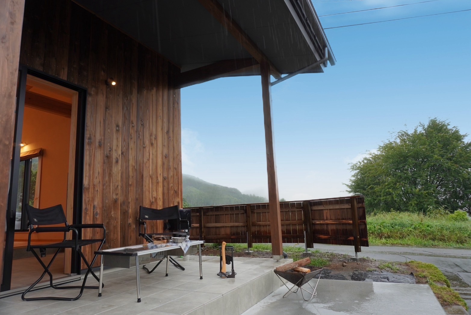 奥行き1820mmの深い軒がかかった外テラスでは、BBQや食事を楽しみながら、中央アルプスを望むことができ、