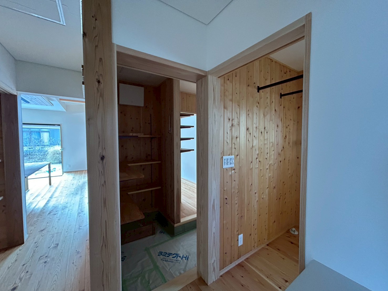 玄関のすぐそばに、洗面や浴室などの水まわりをまとめて配置した、使い勝手の良い“ただいま動線”。