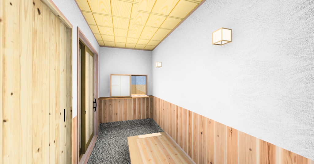 玄関扉には格子デザインの引き戸、玄関ホールの天井には杉材の竿縁天井を採用し、伊那展示場のような和風のデザインにしました。