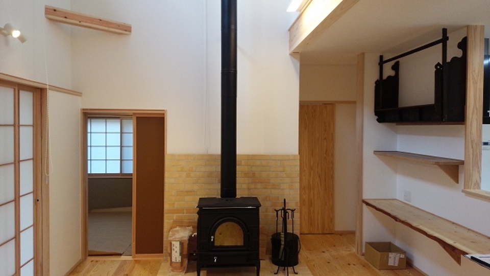 竣工の社内検査を行いました。リビングには薪ストーブがおかれています。右側に見えるのは前の家にあった棚を利用した神棚です。