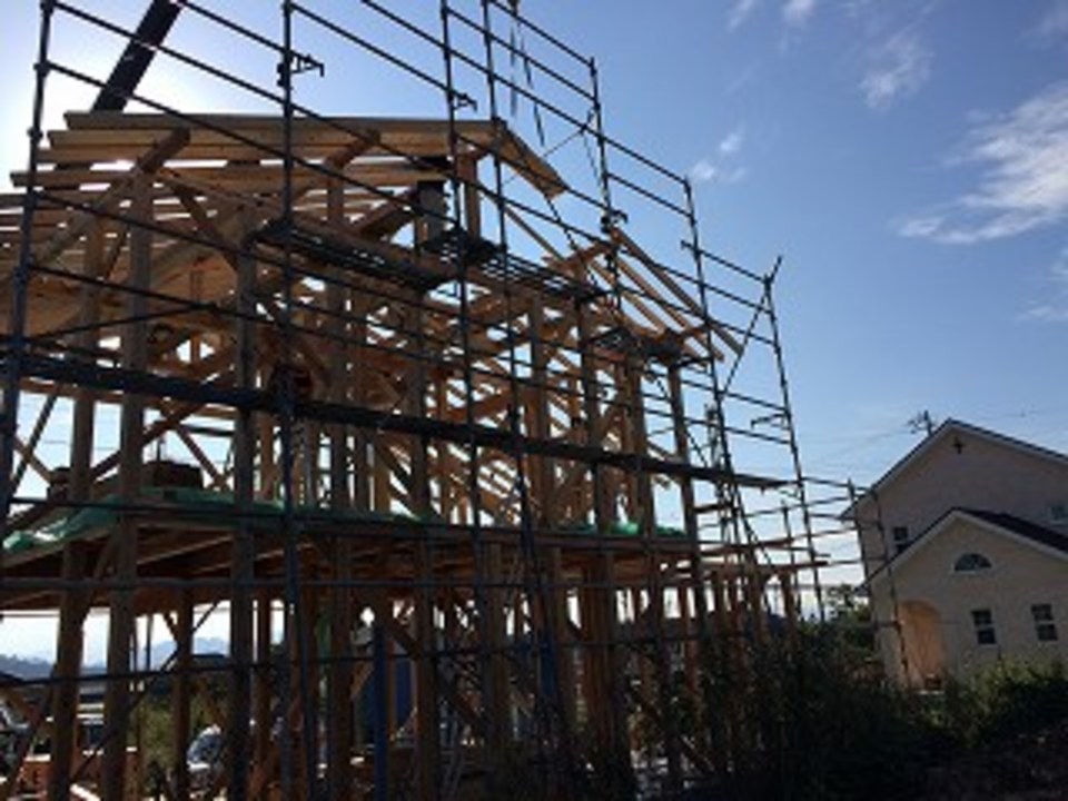 建て方当日を迎えました。晴天に恵まれて建て方日よりになりました。