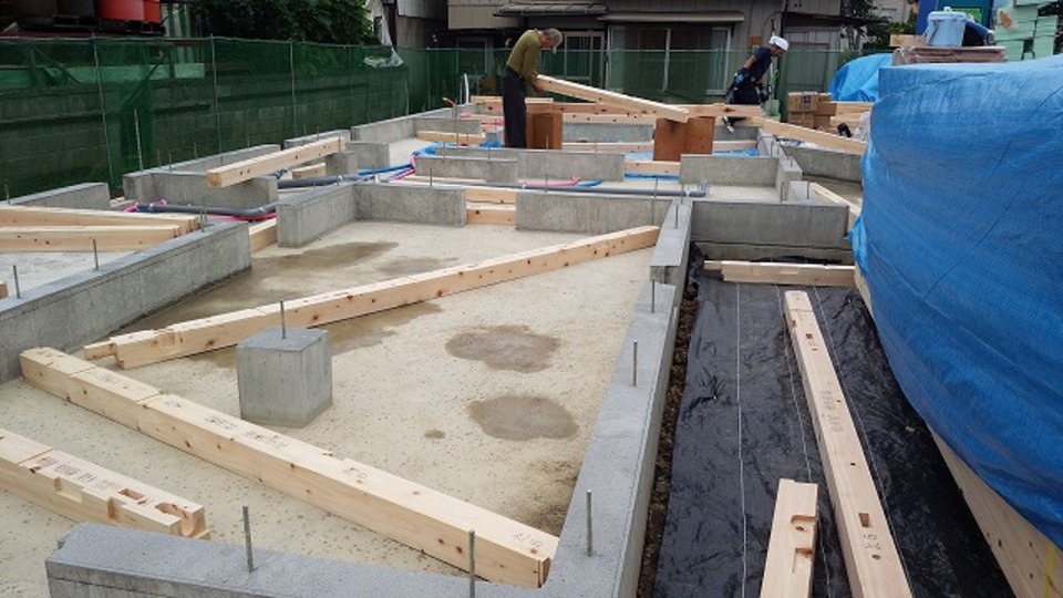 土台敷きが終わるところです。養生をして、建て方を待ちます。