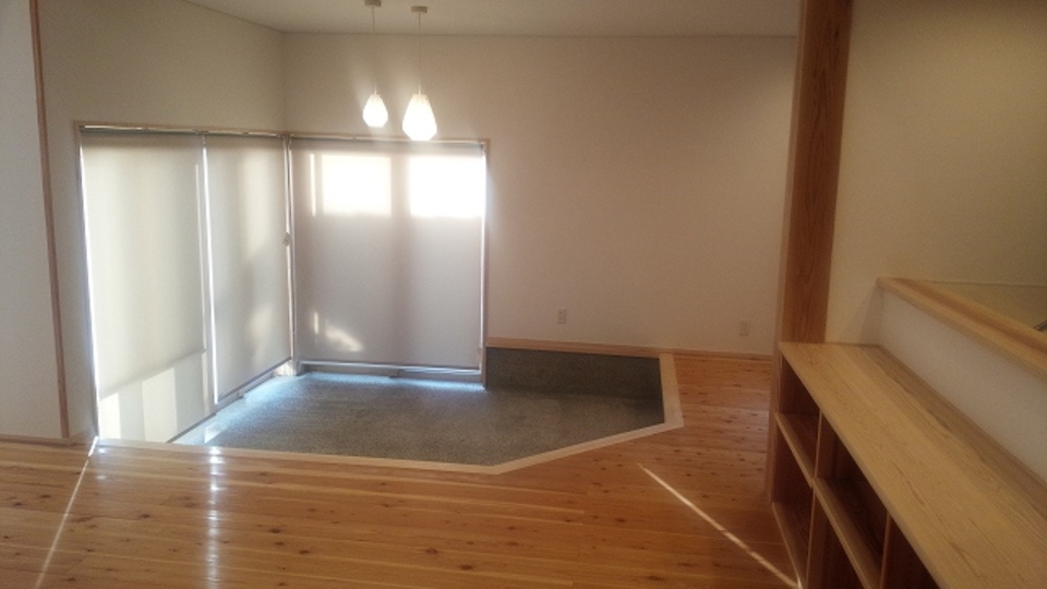 木工事完了の社内検査を行いました。2階の吹き抜け上部には太鼓梁が見えています。