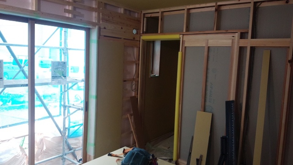 内部の造作工事は、壁の石膏ボード張りへと進んでいます。