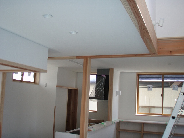 石膏ボードのジョイント処理や、木部の養生がおわり、天井から塗り始めています。早くも、2階の天井は塗り終わるところです。