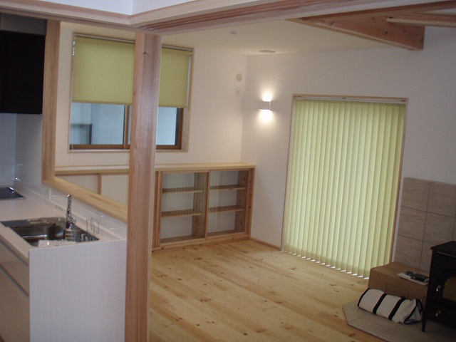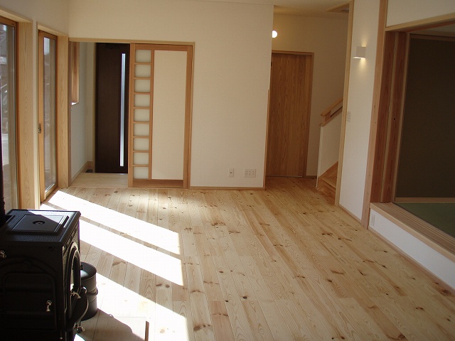 ダイニングから玄関を見たところです。薪ストーブを介してつながった広い空間です。