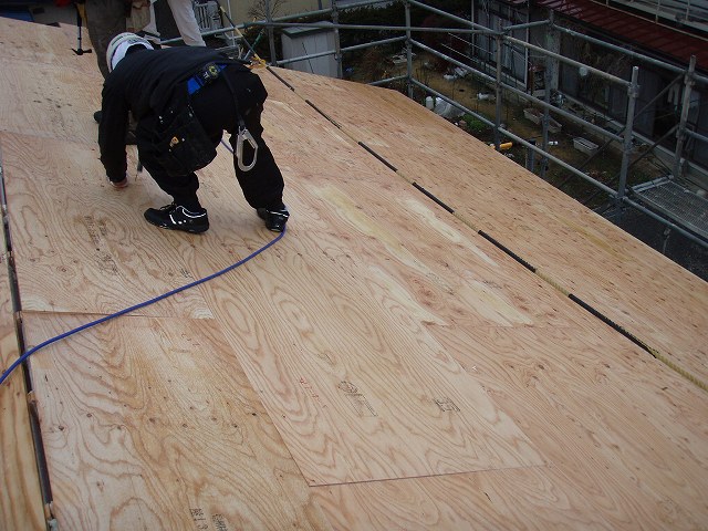 2階は、外部の通気胴縁施工が終わり、床板張りが始まります。