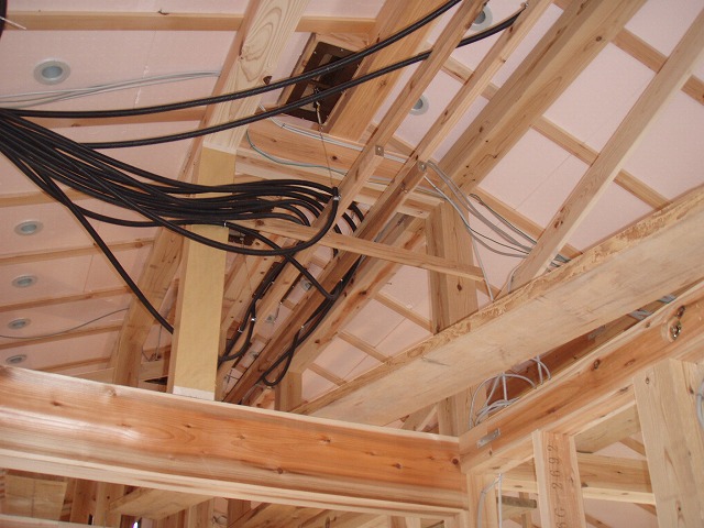 小屋組が組み終わり、垂木を施工します。100mmの断熱材を施工するため、大きな垂木を並べていきます。