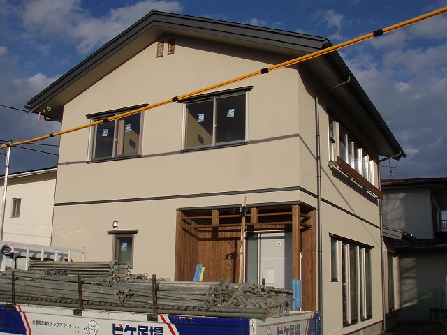 外壁の仕上げが終わりました。竪樋をおろしたり、換気扇のフードの取付けが終われば、足場解体になります。