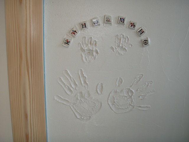 玄関を入った正面の壁に、手形付をしました。まずは、生後3カ月の双子ちゃんからです。なんとか、ご主人が手を開き、一気に手形付です。