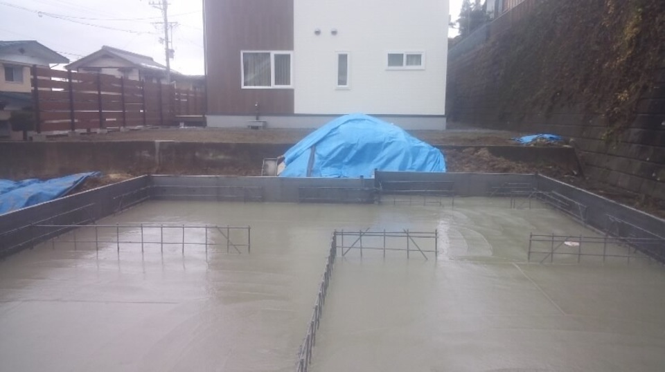 基礎の型枠を建てるための基準コンクリートが打設されました。ブルーシートで覆って養生中です。