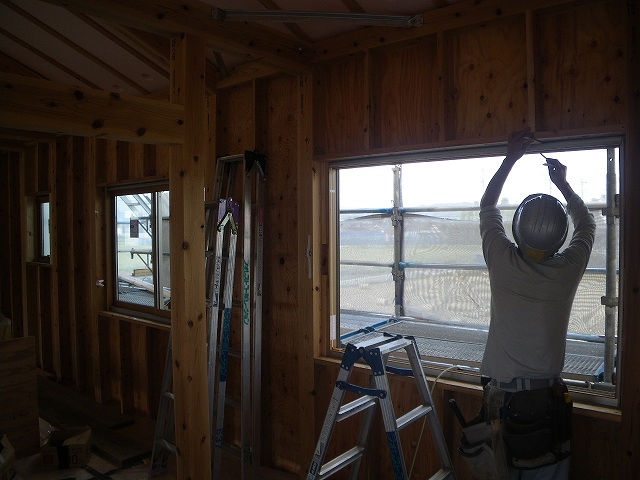 サッシが全て入り、壁に断熱材が入れこまれました。