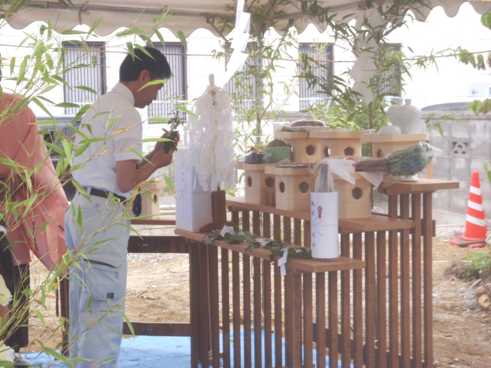 本日は地鎮祭をとり行いました。ご夫婦のご両親様もお越しいただきまして、ありがとうございました。梅雨の時期でしたが天候にも恵まれました。