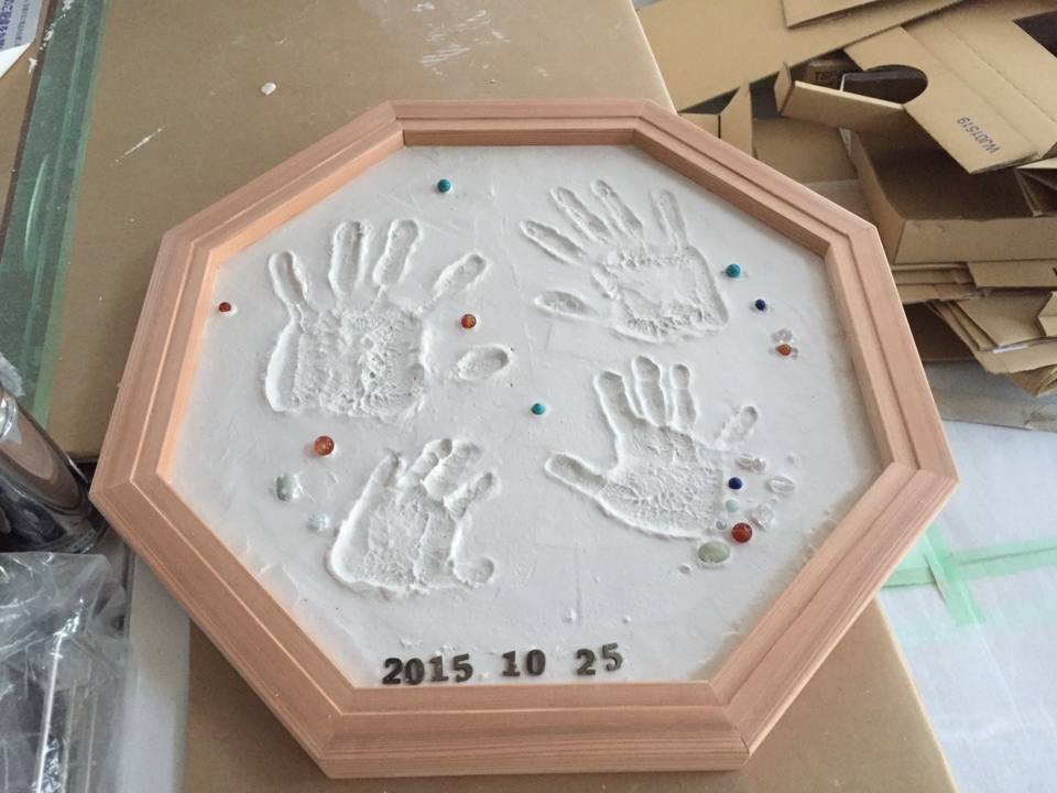 左官屋さんの内部の仕上げもいよいよ終わりです。最後の壁の仕上げと、枠内の手形付けをT様ご家族にやっていただきました。翌日見に行ってみると、楽しみながら思いっきり塗って頂いた様子がよく伝わってきました。縁起のよい八角の枠にご家族の誕生石を散りばめた、アイディア溢れるひとてま工房になりました。