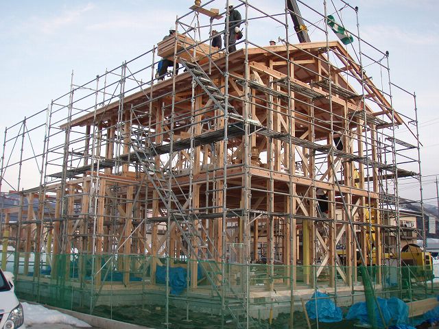 棟木まで組みあがり、無事上棟です。朝は曇っていた空も、昼前からはすっかり晴れて、大工さんも動きやすくなりペースアップです。