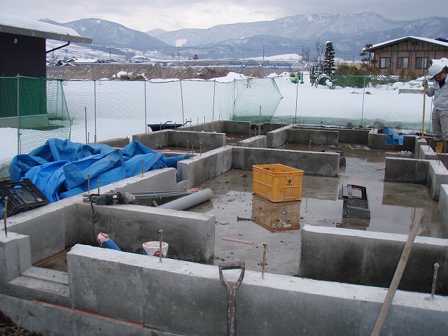 土間のコンクリート施工が終わり、内部の立ち上がり型枠を施工しようとしていた矢先、この積雪です。ブルーシートをかけ、暖房をつけていたので、土間のコンクリートの採暖はできていますが、この雪をおろすまで作業に取り掛かれません。