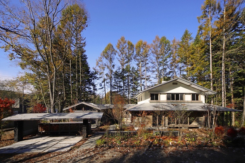 美しい庭木を切り取ったような大きな開口と、対照的に周りを取り囲む下屋空間で、軽井沢の彩り豊かな四季が際立つ。