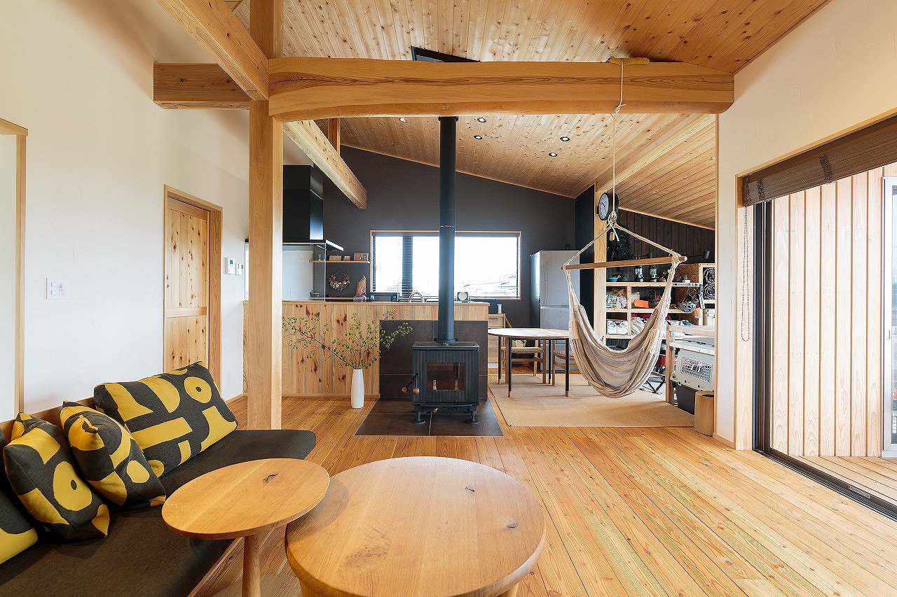 縦にも横にも広がりを感じるLDK.床はカラマツ、柱はヒノキ、梁はアカマツ、天井はサワラ。すべて県産材で、キッチン前の腰板は菌の侵入で変色したブルーステイン材を使用。