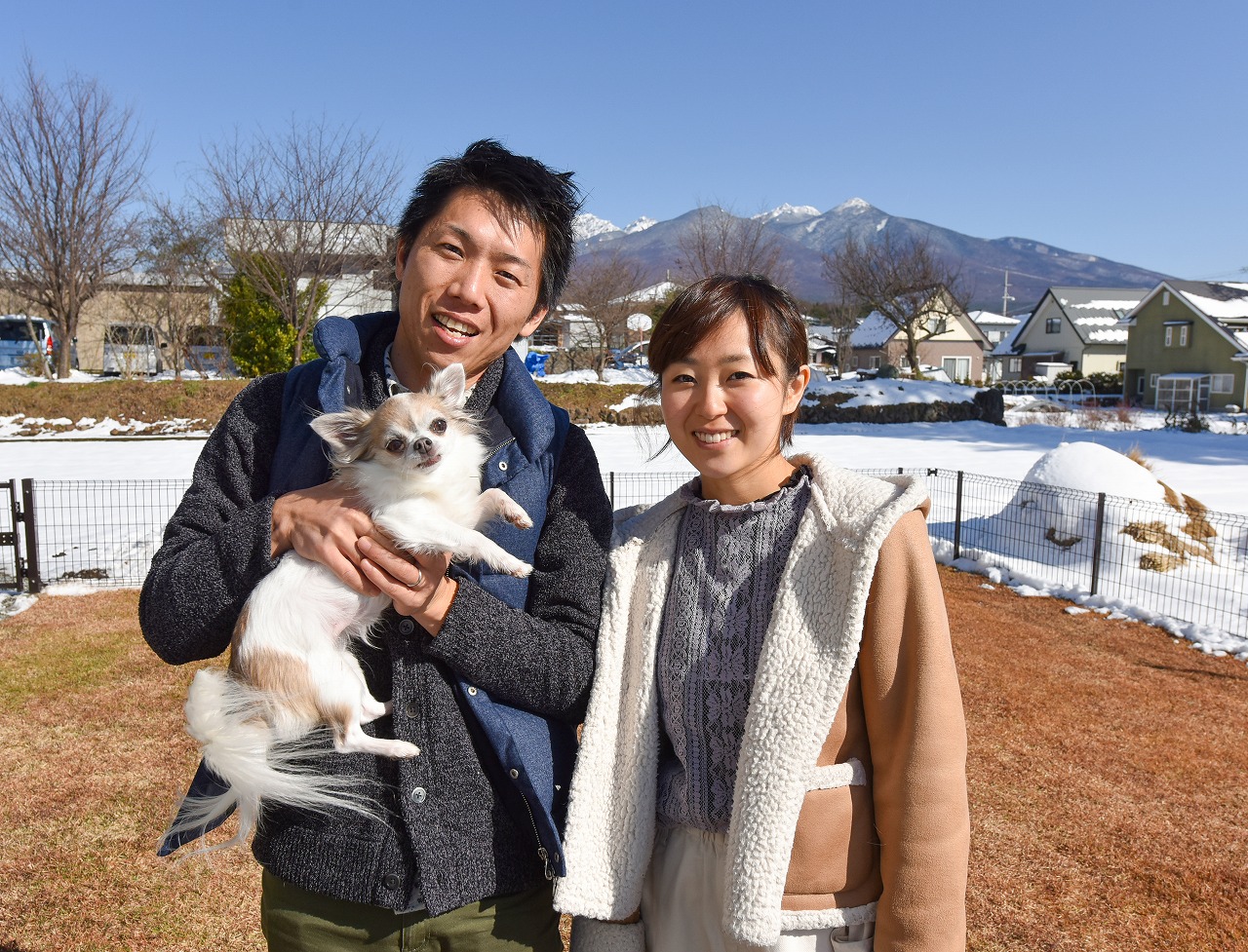 ↑新築当時のご夫婦と初代のワンちゃん 現在は家族が増えワンちゃんも2代目へ